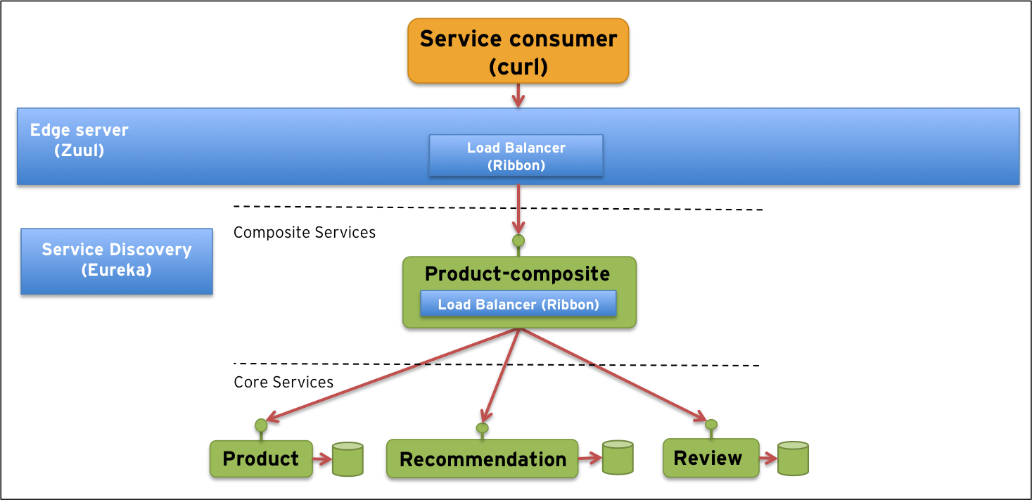 - 一种复合服务,即product-composite,可以汇总来自三种核心服务的信息,并构成产品信息视图以及产品的评论和建议。